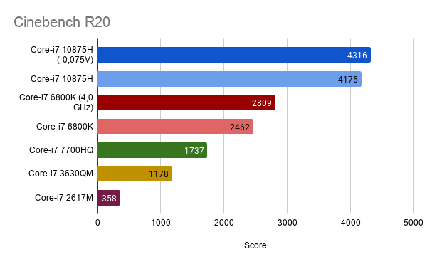 Wat hier gelijk duidelijk wordt is dat de Core-i7 10875H een zeer snelle jongen is. De op 4GHz geklokte 6800K 6C/12T desktop CPU met 140W TDP kan de in vergelijking zeer zuinige laptop CPU totaal niet bijbenen. En vergeleken met mijn dichtstbijzijnde andere laptop, de 2017 Macbook Pro 15 met een Core-i7 7700HQ, is de Core-i7 10875H in de SKIKK 15GMHY ruim 2x zo snel. En dit terwijl deze CPUs op een zeer vergelijkbare architectuur zijn gebaseerd en ook nog eens dezelfde 45W TDP hebben.