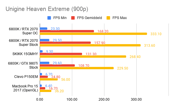 Heaven is een oudere benchmark van Unigine, vooral ontworpen om de tesselation prestaties van GPUs te meten. Ik heb deze benchmark toegevoegd om op grafisch niveau een vergelijking te kunnen maken met de GTX 675MX uit mijn Clevo P150EM laptop en de Radeon Pro 555 uit mijn Macbook Pro 15. Voor de benchmark heb ik de Extreme preset gebruikt, die een resolutie van 1600x900 hanteert. De Macbook is het enige systeem dat gebruik moest maken van de OpenGL API in plaats van DirectX 11.