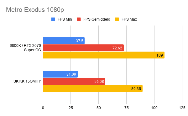 Er is duidelijk zichtbaar dat Metro Exodus een zeer zware game is. Zelfs de meest krachtige hedendaagse desktop PC heeft moeite om op hoge kwaliteit een speelbare framerate te leveren. Al met al is het resultaat wat de lichte en relatief dunne 15GMHY laptop haalt zeer indrukwekkend te noemen.
