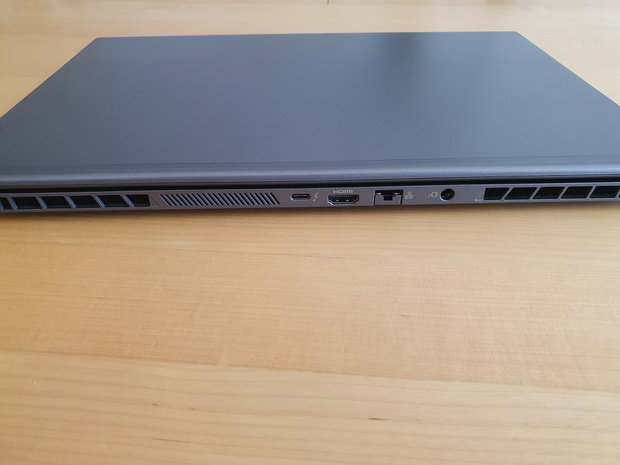 De achterzijde van de laptop vinden we een HDMI 2.0, Thunderbolt 3, Gigabit Ethernet en de adapter aansluitingen.