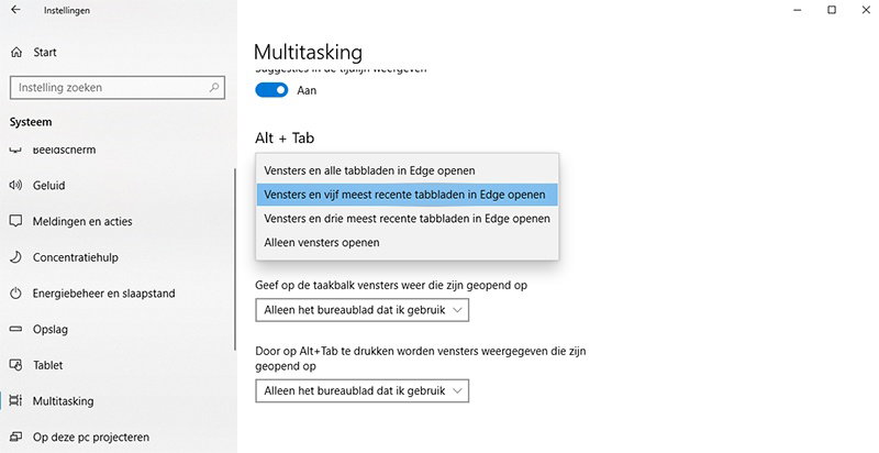Related to this, you will now find open tabs in Edge when you press Alt + Tab. This way you can quickly switch between open programs and websites. If you prefer the old ways of 'alt-tabbing' back, arrange this via Settings, System, Multitasking, Alt + Tab.